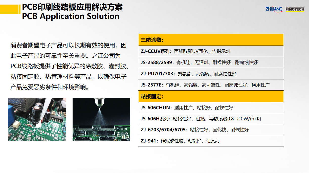 之江公司立足于中國膠粘劑行業(yè)領(lǐng)軍企業(yè)和有機(jī)硅、聚氨酯、環(huán)氧等專業(yè)膠粘劑的創(chuàng)新和產(chǎn)業(yè)化優(yōu)勢,具有國家高新技術(shù)企業(yè)和國家級企業(yè)技術(shù)中心資質(zhì),依靠國家級CNAS實(shí)驗(yàn)室以及國家級博士后科研工作站,并有國際專家助力,為PCB印刷線路板的三防涂敷、粘接固定、導(dǎo)熱灌封等提供系統(tǒng)用膠解決方案。其中,關(guān)鍵產(chǎn)品如下:
